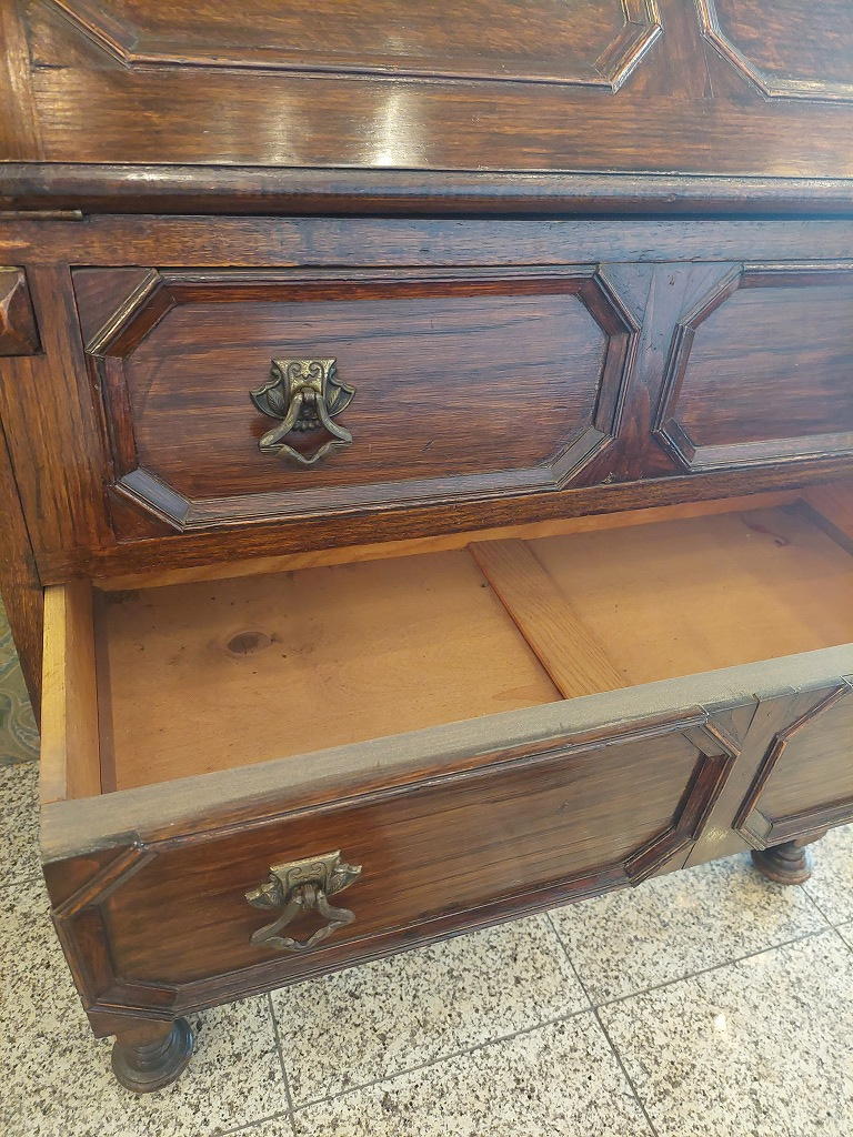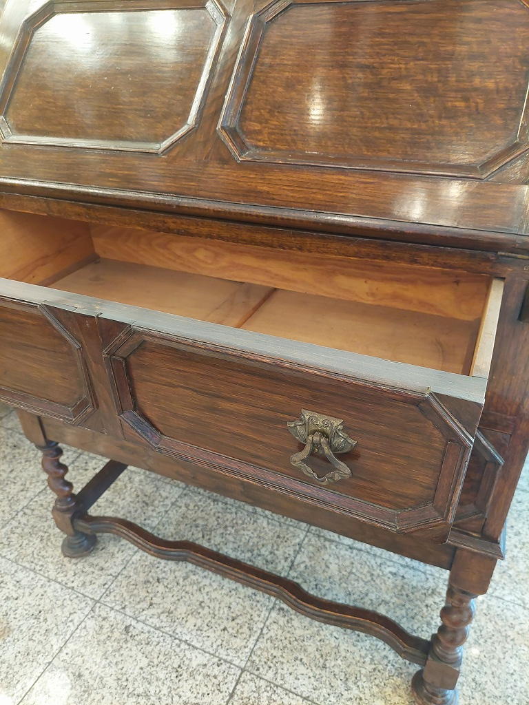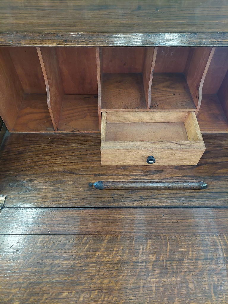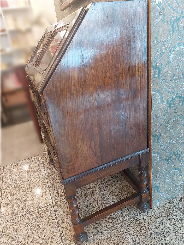 扉を前に倒すと書き物などができる机になり、閉じると収納家具・飾り棚として使えるアンティーク家具です。