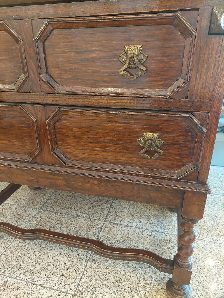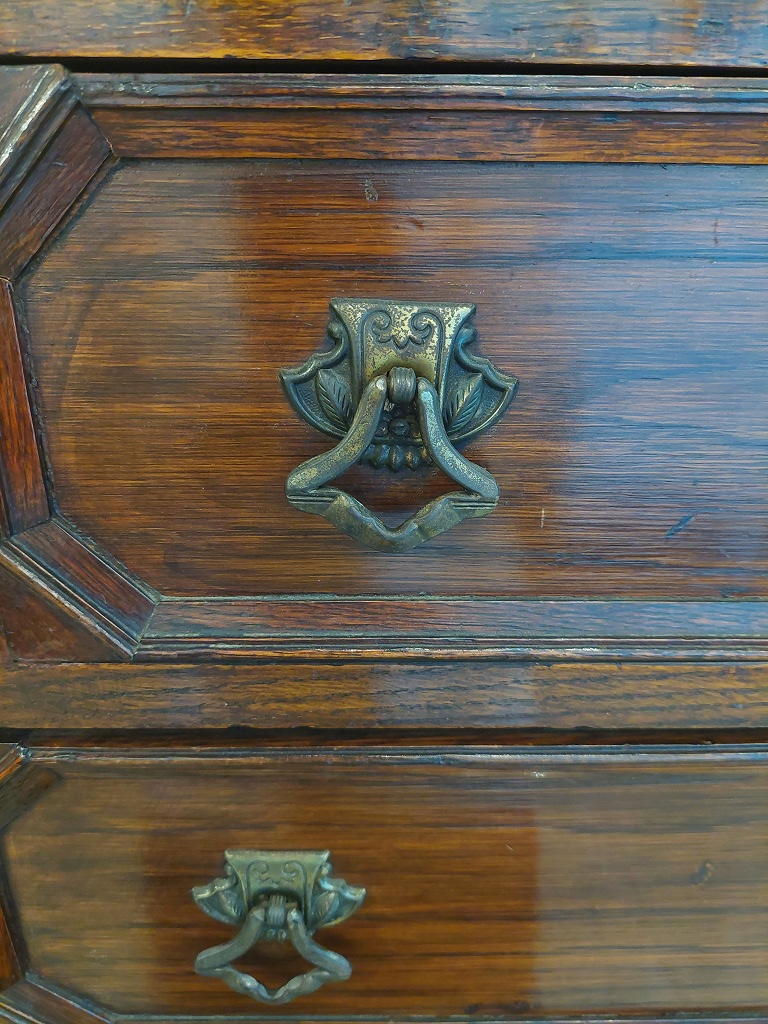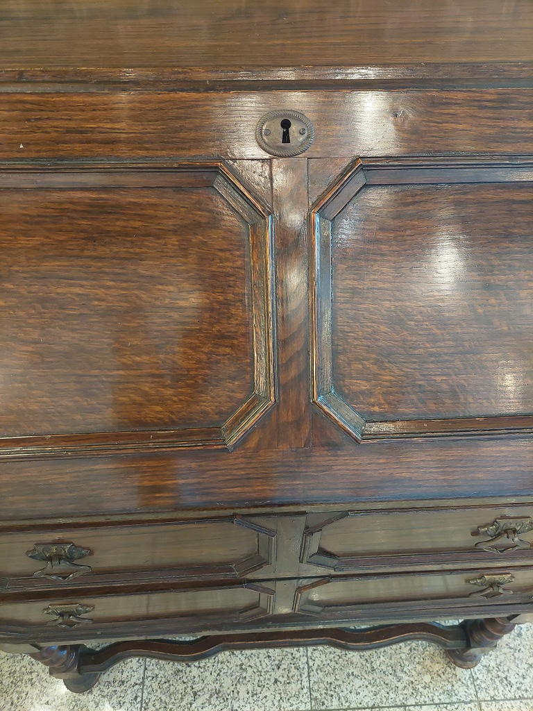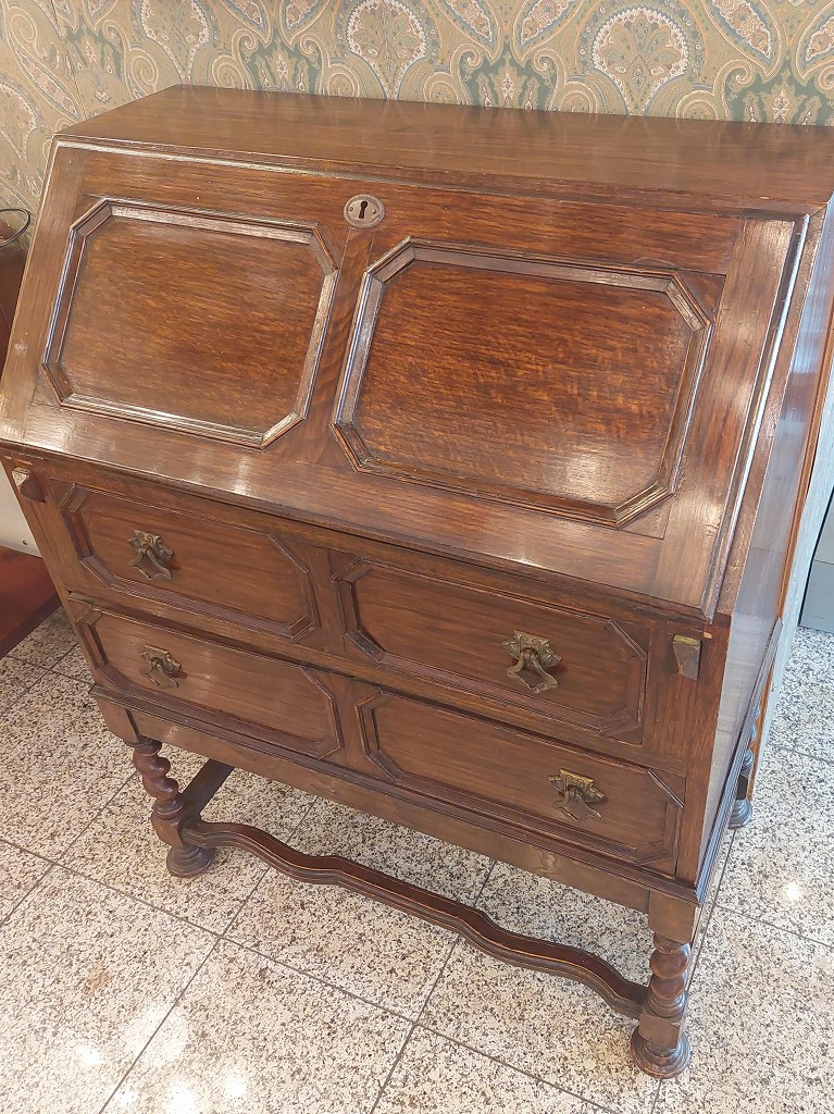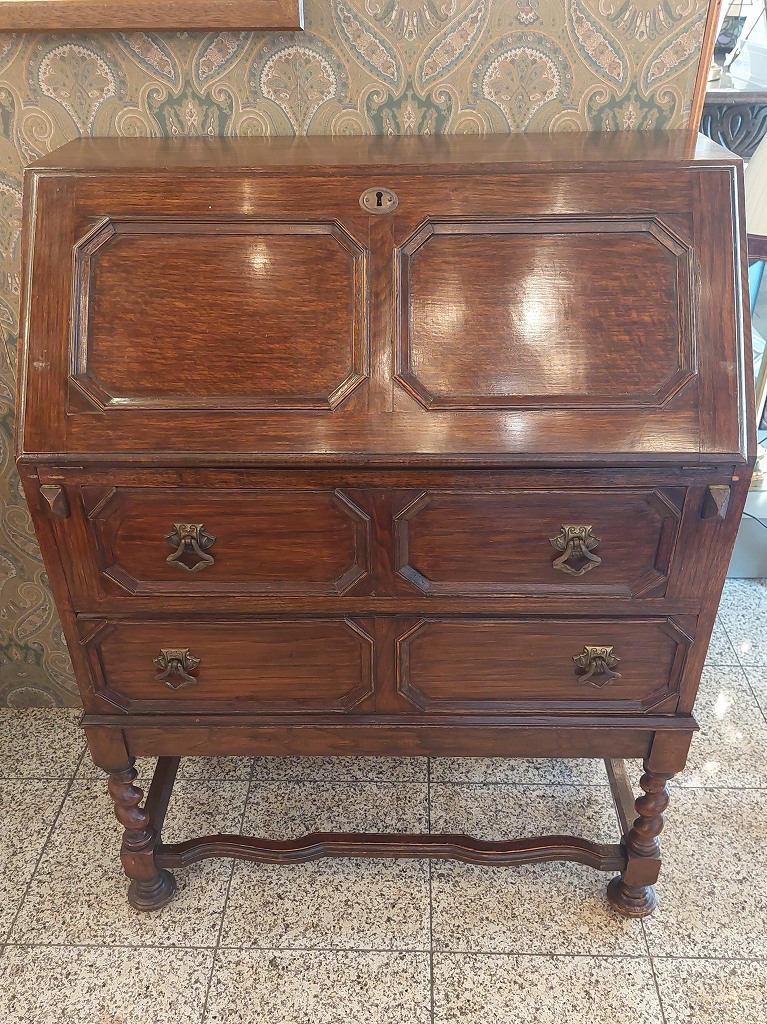扉を前に倒すと書き物などができる机になり、閉じると収納家具・飾り棚として使えるアンティーク家具です。