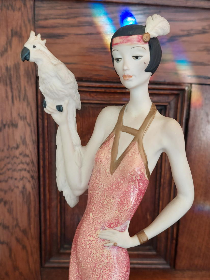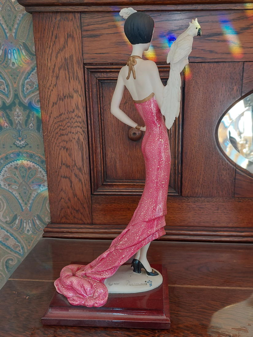 繊細な手のしぐさ、長いドレスの質感、鳥との対比などが特徴で、1980〜1990年代頃に制作・販売されていたモデルです。