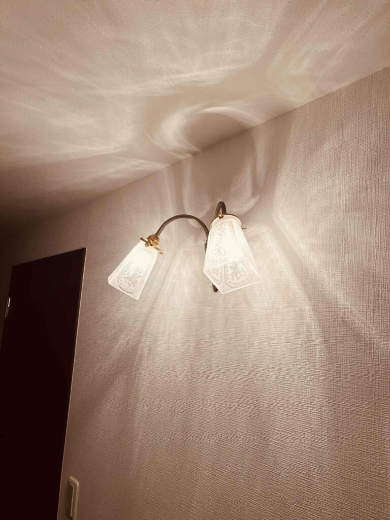 ガラスシェード越しの光が天井に柔らかな模様を描き、空間に奥行きを与えています。