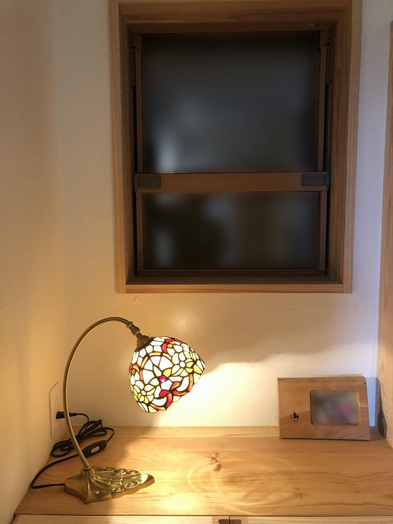 あたたかな木の風合いが写真からも伝わってきます。ちょうどワンポイントになるように、テーブルランプを設置して頂きました。華やかなステンドグラスのガラスシェードですが、とてもあたたかい雰囲気をもっているので、ぴったり調和していますね。