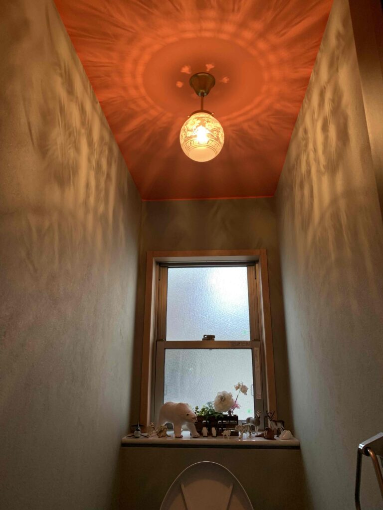 白いガラスと赤い天井のコントラストが絶妙です。 全体的にあたたかみのあるカラーでほっとできる空間でありながら、目を引くおしゃれな組み合わせですよね。 ガラスの影がレースのカーテンのようです。